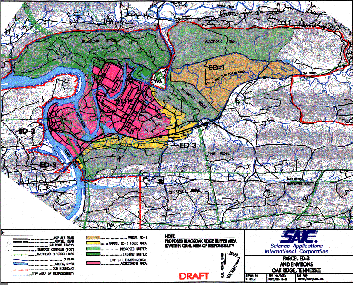 - Parcel ED-3. In February 2000 DOE released a draft environmental assessment on the proposed leasing (for development) of Parcel ED-3. Following a lot of public comment, DOE completely revised the EA and published it for public comment in the fall. AFORR urged our public officials to withdraw the proposal. On January 30, 2001, DOE ORO Manager Leah Dever announced that this proposal was being "put on pause" while DOE puts it "in context with its vision" for the ORR. This is only a temporary reprieve—we know that the Community Reuse Organization of East Tennessee (CROET) is exerting tremendous political pressure on DOE to give CROET control of this land for development.